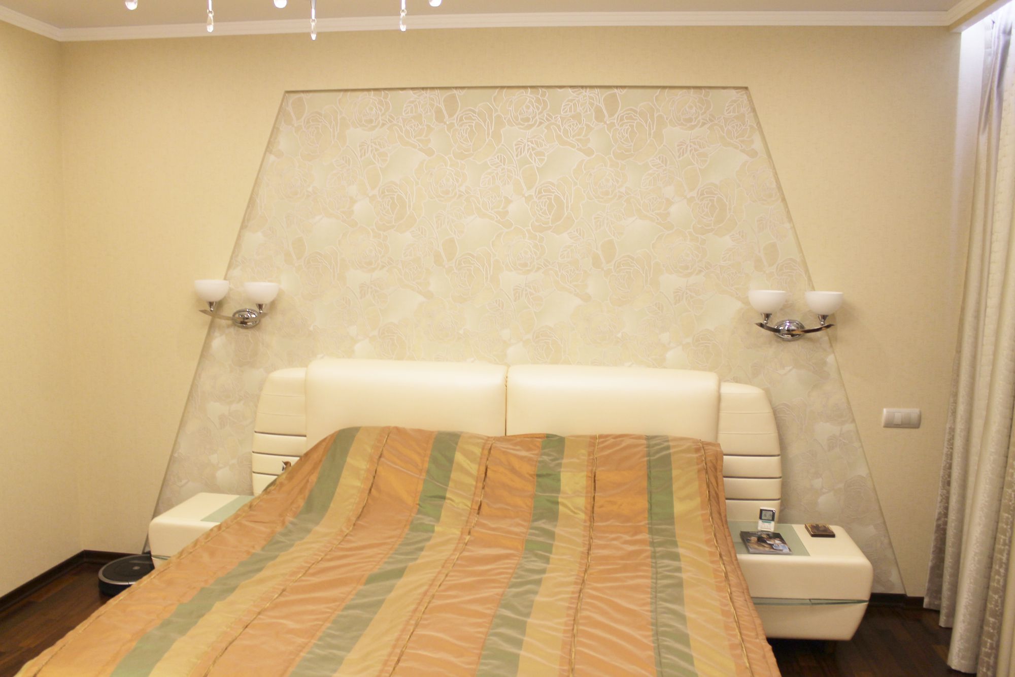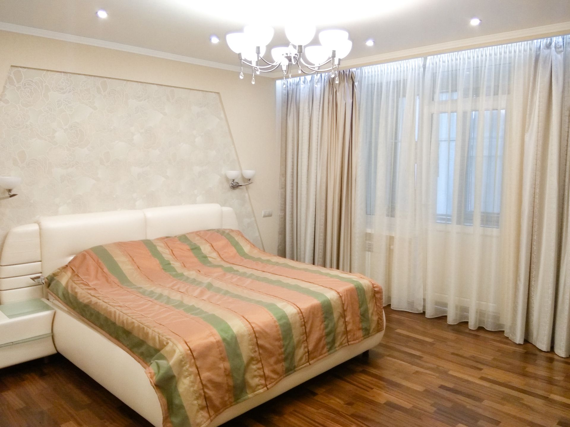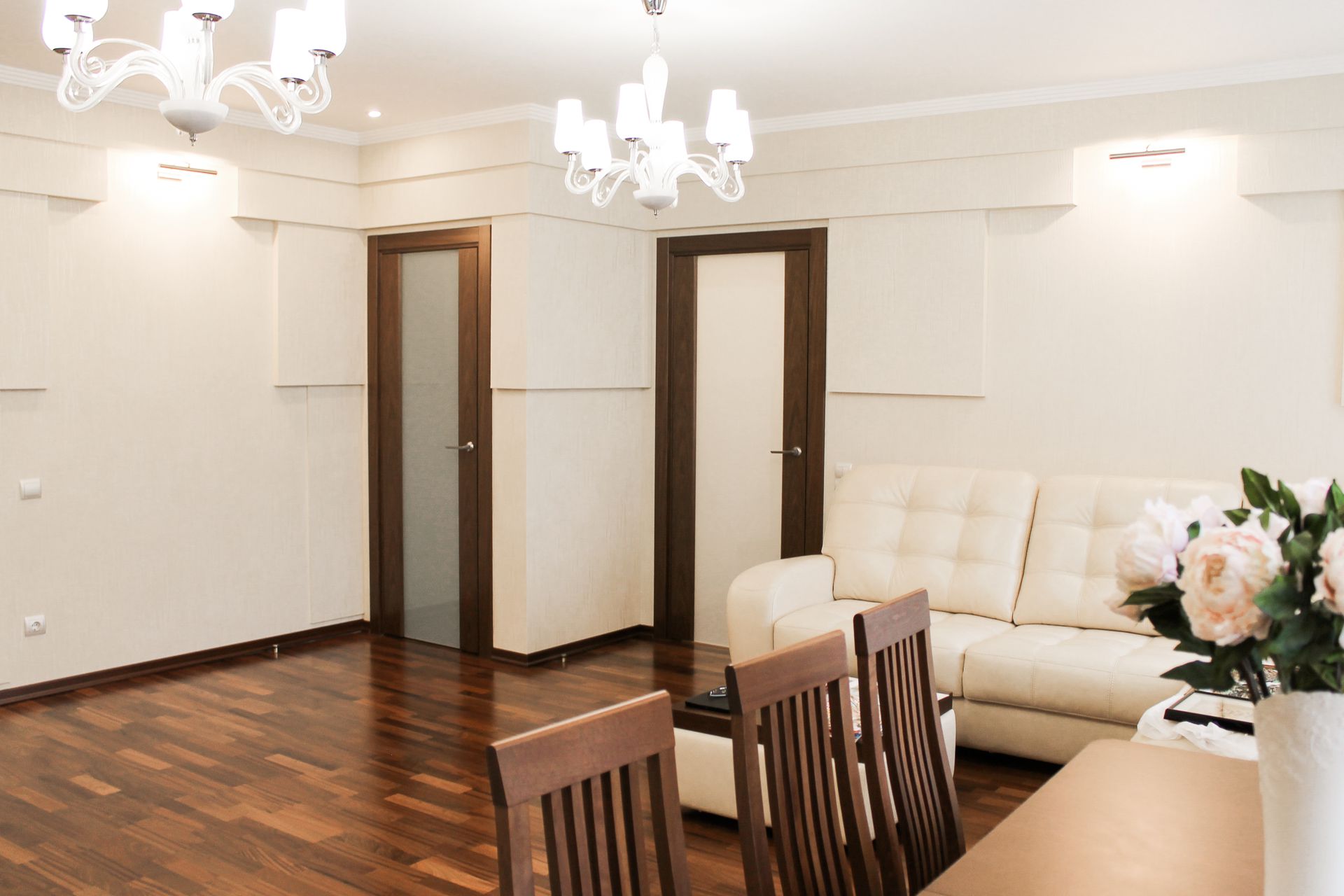 На момент начала дизайн-проекта квартира находилась в свободной планировки, нашей задачей являлась создать трёхкомнатную квартиру, отвечающая следующим параметрам: получить максимально большую и эргономичную гостиную совмещенную с кухней и коридором, но при этом придумать некий дизайнерский ход, который позволил бы зонировать кухню и гостиную. Заказчики с нашей помощью хотели найти «золотую середину» между обилием дизайнерских приемов в интерьере и дорогой мебелью/декора, то есть получить квартиру в которой веял бы дух практичности, простоты, стиля и богатства.